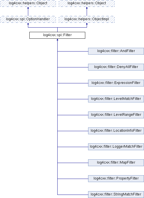 Implemented in log4cxx::filter::LevelRangeFilter, log4cxx::filter::ExpressionFilter, log4cxx::filter::MapFilter, log4cxx::filter::AndFilter, log4cxx::filter::StringMatchFilter, log4cxx::filter::LoggerMatchFilter, log4cxx::filter::LevelMatchFilter, log4cxx::filter::LocationInfoFilter, log4cxx::filter::PropertyFilter, and log4cxx::filter::DenyAllFilter.